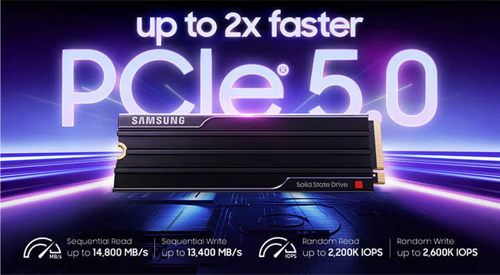 Samsung 9100 Pro được trang bị giao tiếp PCIe 5.0 x4 và chuẩn NVMe 2.0 mới nhất, cho tốc độ đọc lên đến 13.000 MB/s và ghi 10.000 MB/s. Đây là bước tiến mạnh mẽ so với SSD PCIe 4.0 thông thường, mang lại khả năng xử lý cực nhanh cho các tác vụ nặng như dựng video 8K, AI/ML, chơi game AAA hoặc làm việc với dữ liệu lớn. Với băng thông cao và độ trễ cực thấp, sản phẩm này phù hợp cho người dùng chuyên nghiệp cần hiệu suất vượt trội.